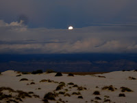 Indeed, last night the heavens did declare God's glory! Rick and I drove back out to White Sands to witness two things: the sunset and the moonrise. And God spoke from the skies with glory! The colors of the western sunrise lasted for nearly an hour as first the colors lit up the clouds high above, creating at times tongues of fire, halos of light outlining the clouds, and finally a deep orange glow silhouetting the San Andres range of mountains. When we turned around, the moon was peeking up above the bank of clouds that had kept it hidden until the sun finished it's display. Gradually, as the skies darkened, the light of the moon began to cast shadows in the sparkling white sands. No speech or words, yet God's message was heard.