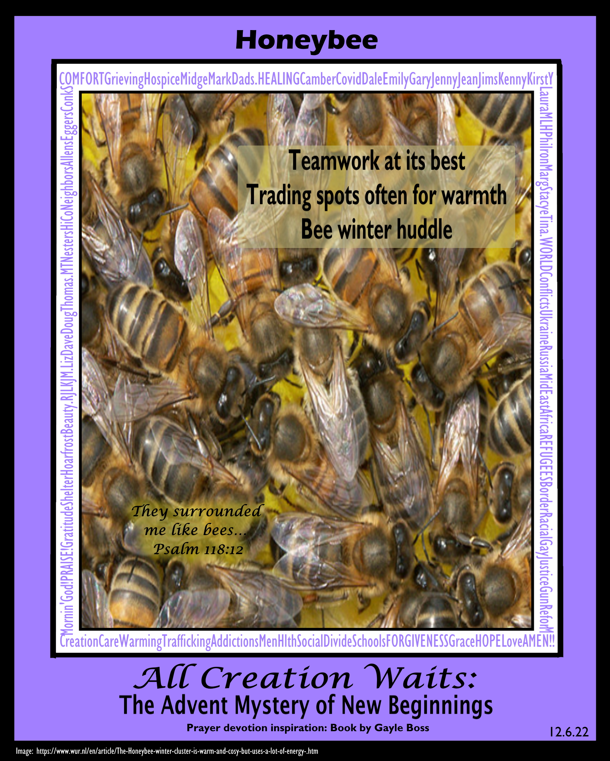 In this book we hear for the first time the ancient wisdom of Advent: The dark is not an end, but the way a new beginning comes. The author had been looking for a way to mark the Advent season in link with the cycles of creation, not with pop-open windows revealing candy, elves, or angels. All Creation Waits is the result. I added scripture when appropriate and a haiku reflecting the habits of the featured animal. Most photographs are from the internet, and by Dec 2 I remembered to include the web address!