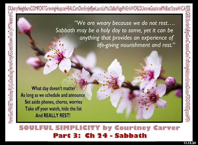My daily prayer pictures are based on the cherry blossom illustrations Carver uses throughout the book. Why cherry blossoms? I had to look that up, but I love the 'springtime' feel in the midst of autumn! (And who doesn't like cherries??) So, according to the internet, cherry blossoms "symbolize both life and death, beauty and violence. As the coming of spring promises new life, so the blooming of cherry blossoms brings a sense of vitality and vibrancy. At the same time, their short lifespan is a reminder that life is fleeting." So this process of simplifying our lives can bring a sense of new life!